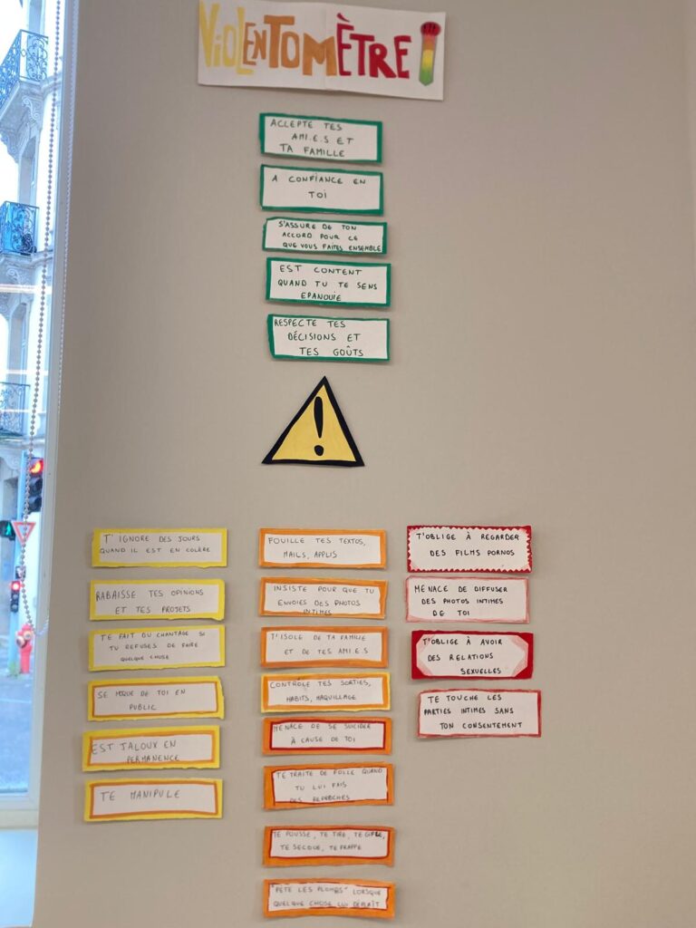 A cette occasion, les élèves ont découvert l’exposition « Carton rouge », dont les clichés photographiques ont été réalisés par Catherine Cabrol, photographe engagée, heurtée par le décès de son amie Marie Trintignant, tuée par son conjoint. Elle a croisé sa passion pour la photographie avec celle du sport et a imaginé « Carton rouge »: des témoignages de victimes de violences, sportifs et sportives, sur leur lieu de pratique sportive. Ici, le « Carton rouge »dénonce les abus et devient un signe d’espoir pour sensibiliser le public à la lutte contre les violences. A cette occasion, plusieurs outils ont été présentés aux élèves, dont le « violentomètre », ou le fait de savoir et pouvoir donner son consentement de manière consciente, libre et explicite. Une matinée instructive pour les filles ET les garçons, à égalité de droits.